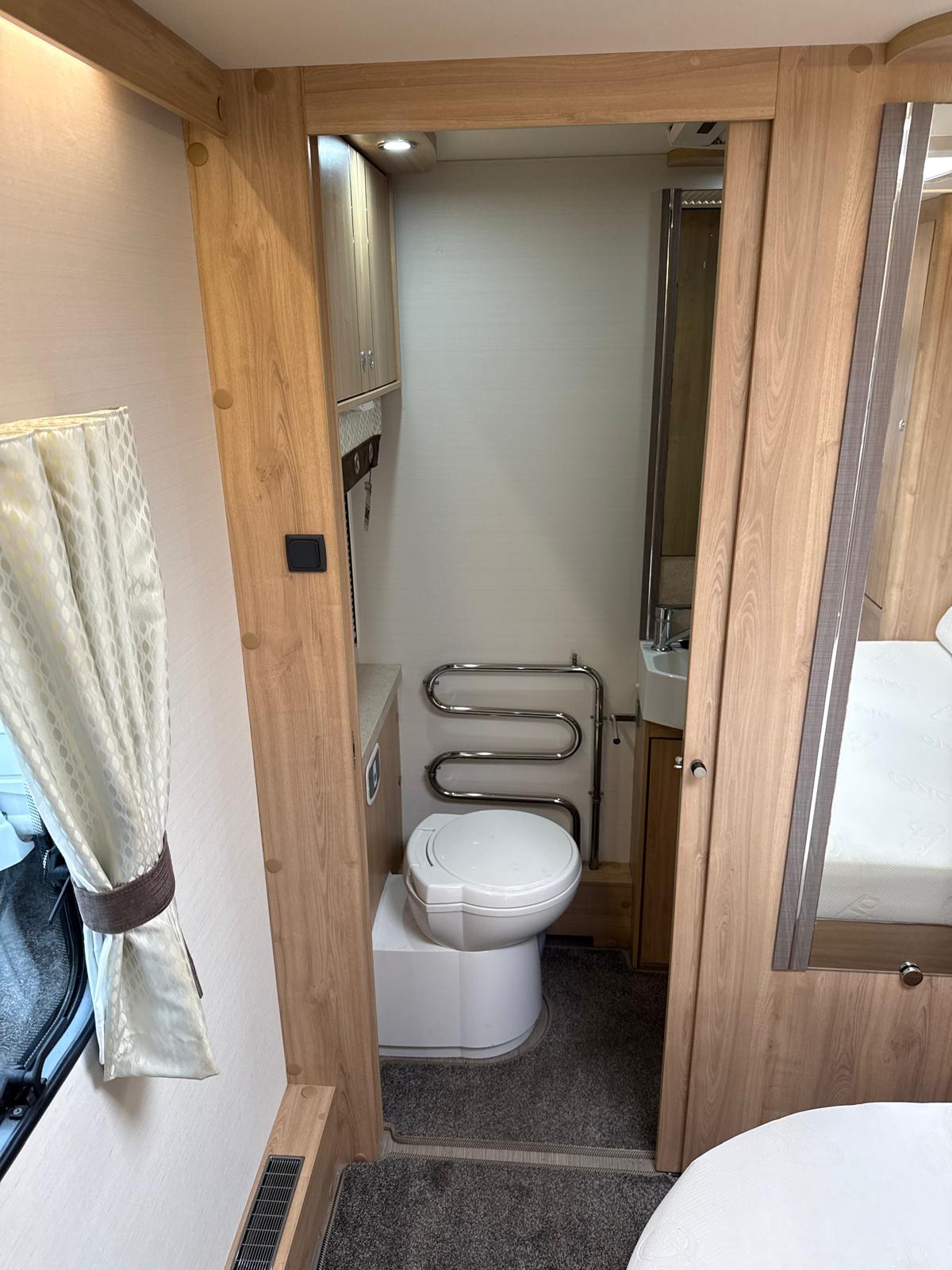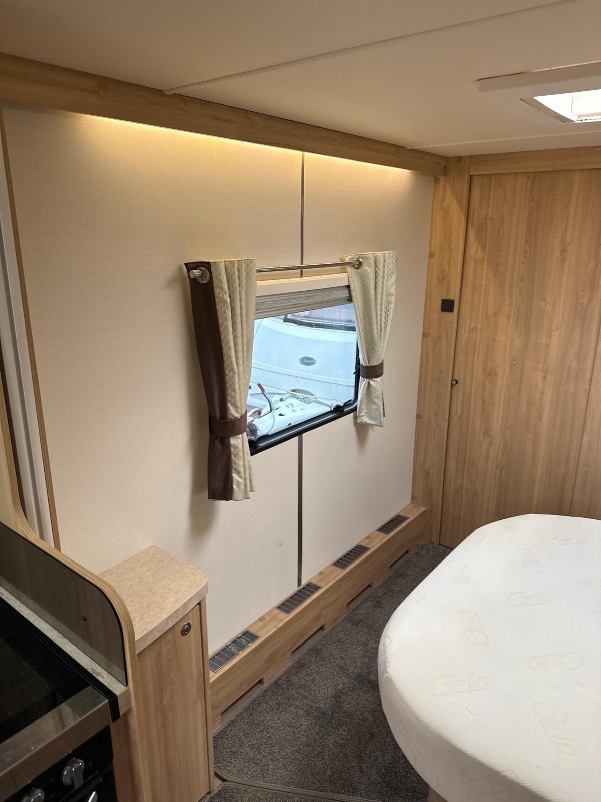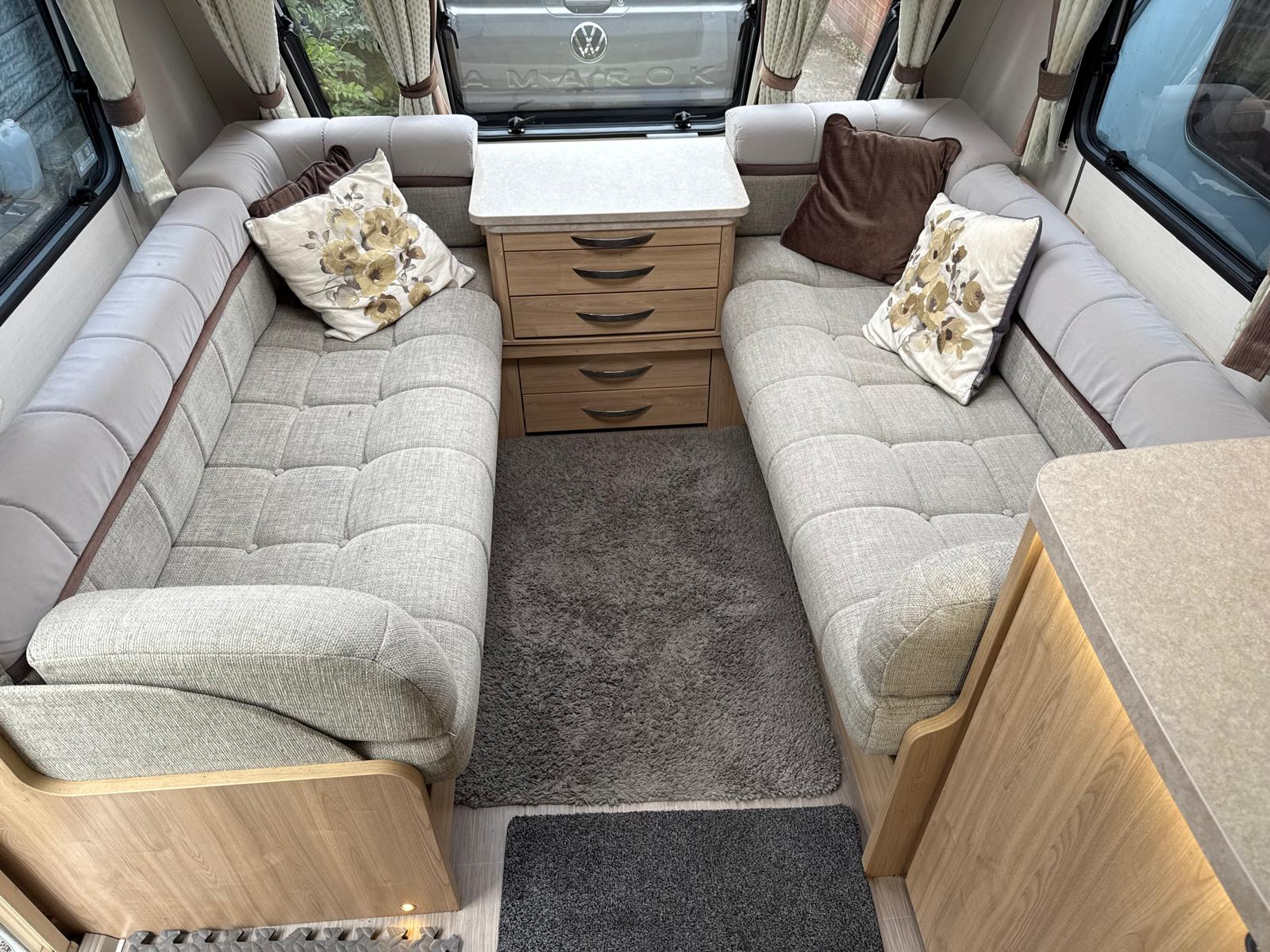 Towards the rear, a fixed transverse island bed provides a comfortable and private bedroom, leading on to a full-width end bathroom with a separate shower, cassette toilet, and hand basin.