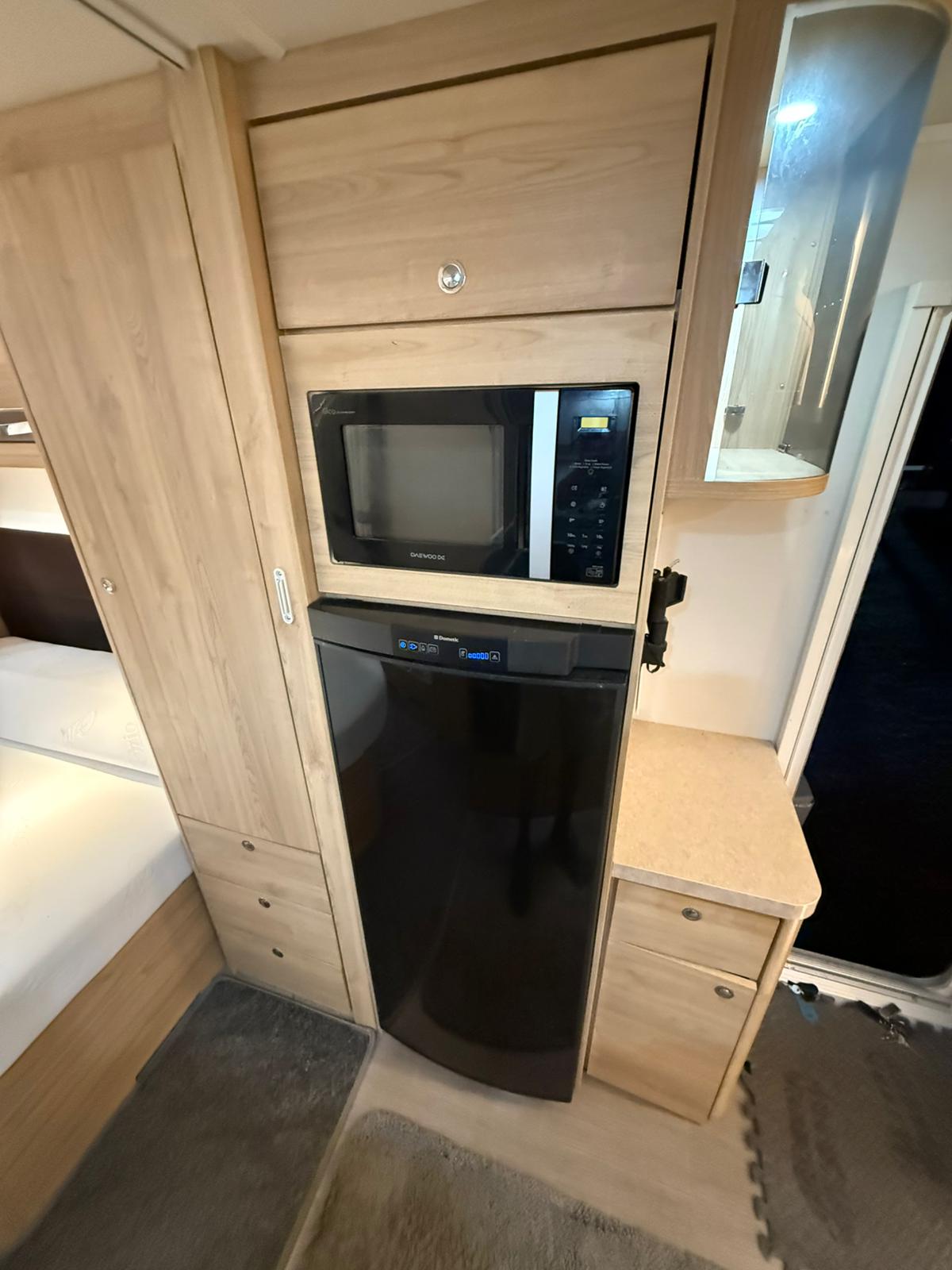 At the front, the lounge offers parallel sofas and panoramic windows, creating a bright and relaxing living area that easily converts into a double bed. The central kitchen is comprehensively equipped with a full oven, grill, gas hobs, microwave, and a large fridge freezer, along with generous storage — perfect for longer trips.