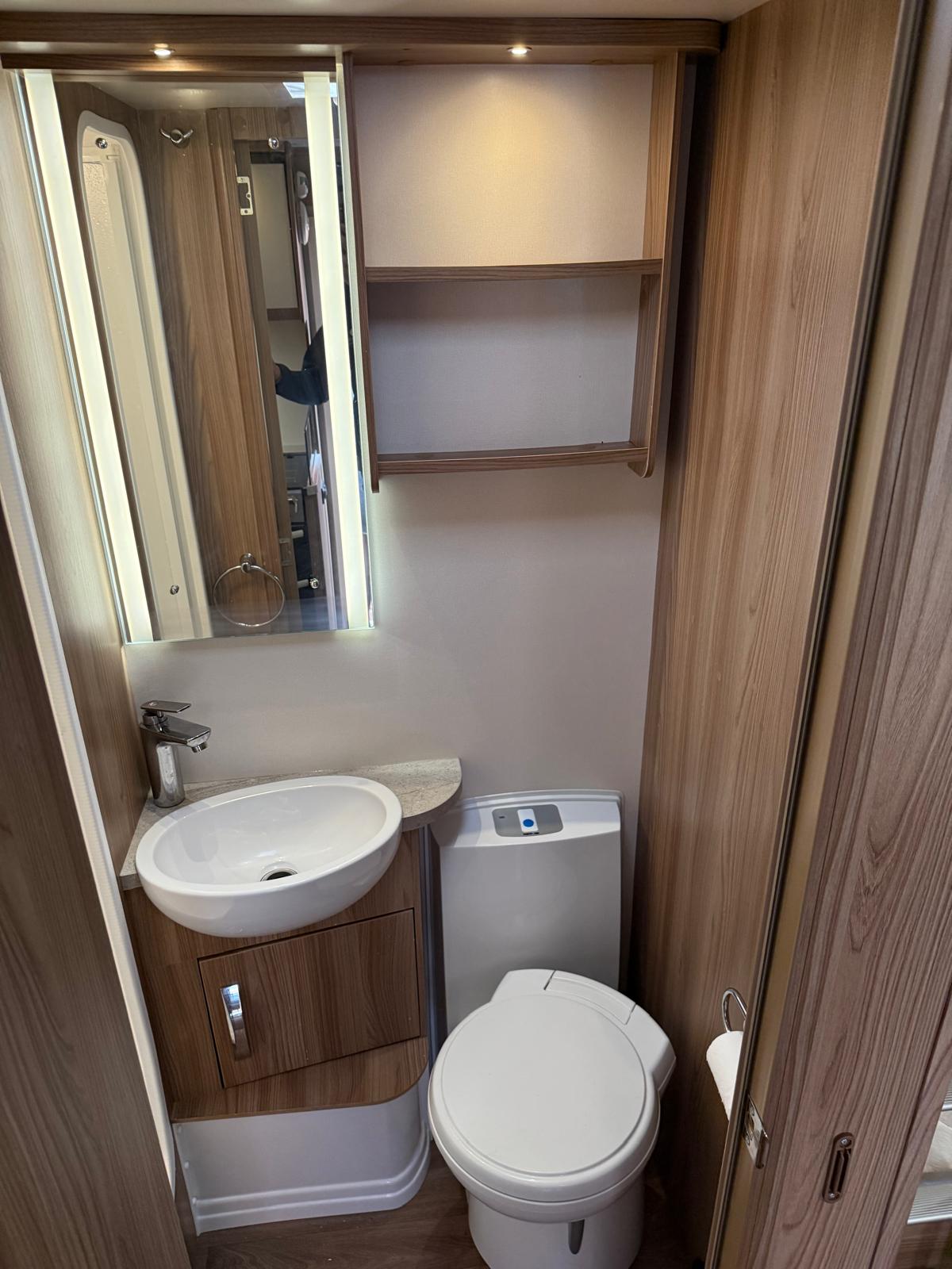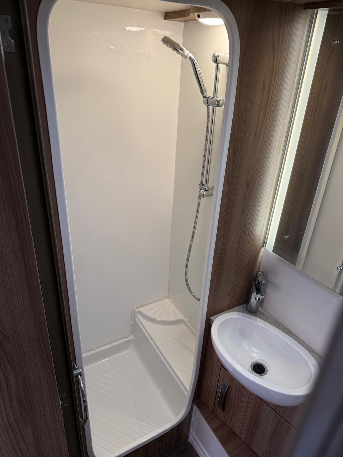 The central washroom provides a convenient separation of space, featuring a cassette toilet and separate shower. To the rear, fixed bunk beds offer dedicated sleeping for children, while a side dinette converts into additional bunks, allowing the caravan to comfortably sleep up to six.