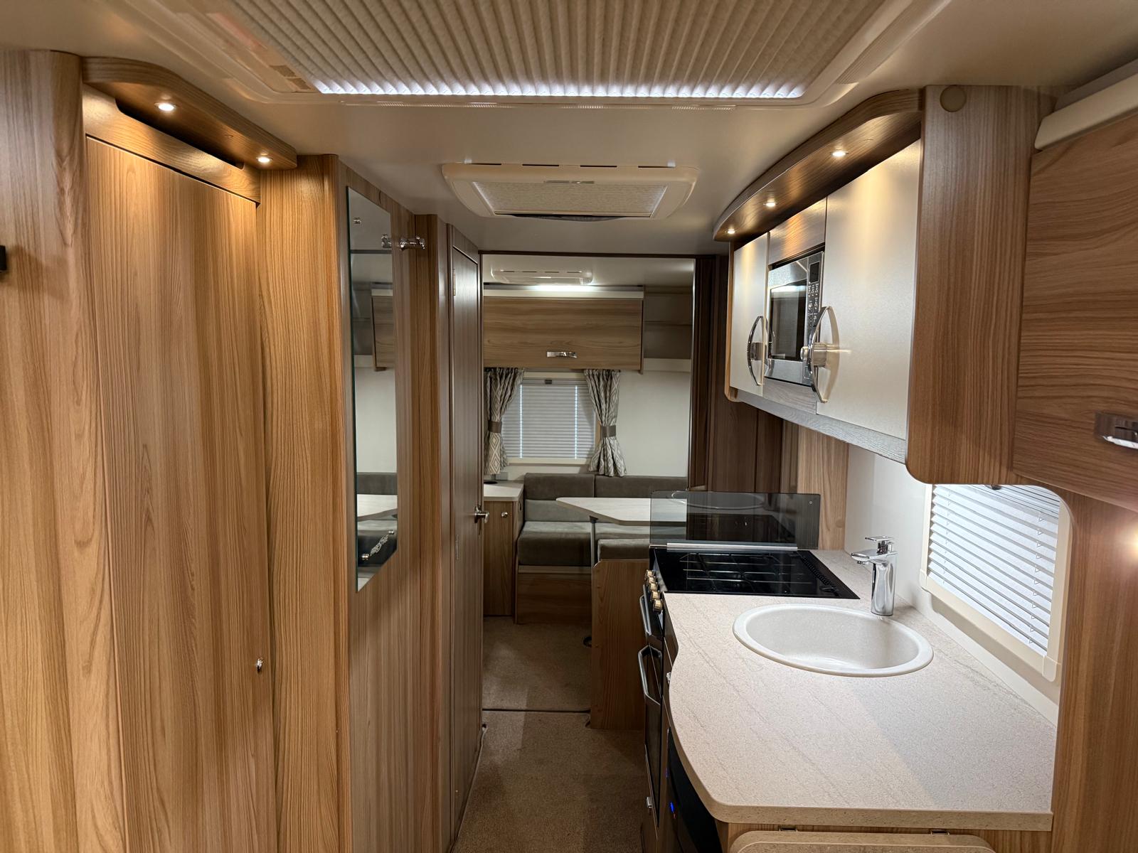 At the front, a bright lounge with large windows and a rooflight provides a comfortable living space that converts easily into a double bed. The central kitchen is well equipped with a full oven, grill, gas hobs, microwave, and fridge freezer, along with good storage and worktop space.